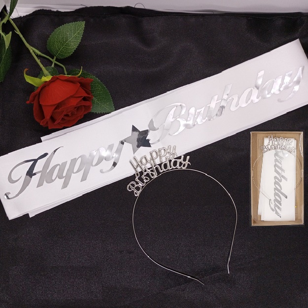 Toptan Happy Birthday Kuşak ve Taç Set Beyaz Gümüş